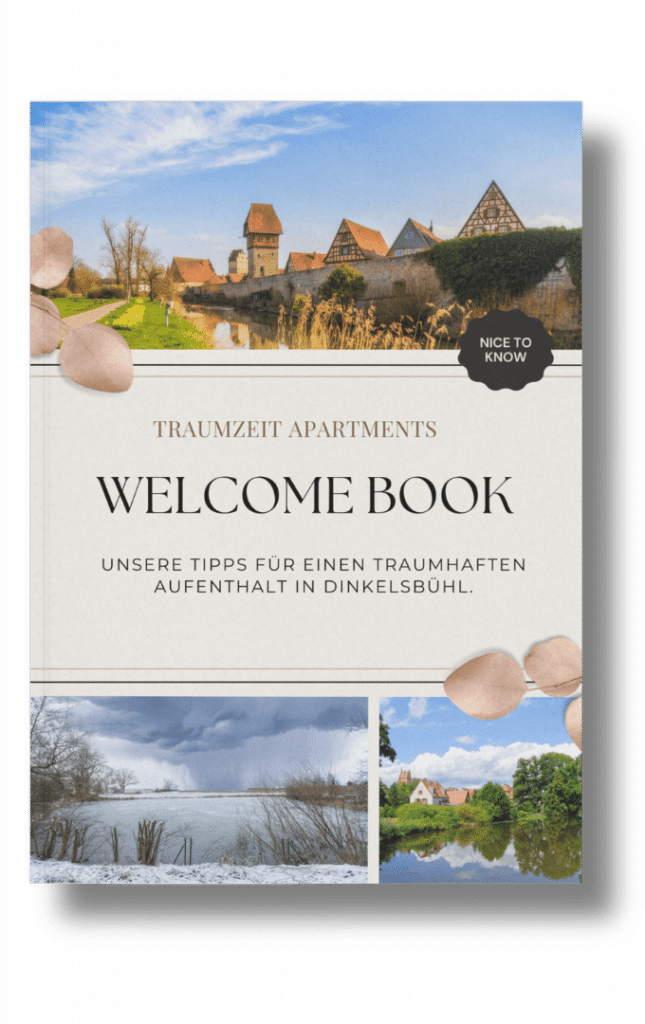Freu dich auf einen entspannten Aufenthalt in Dinkelsbühl und lass dich von unserem liebevoll zusammengestellten Welcome Book begleiten. Darin findest du persönliche Empfehlungen zu den schönsten Sehenswürdigkeiten, gemütlichen Restaurants und abwechslungsreichen Freizeitaktivitäten – perfekt, um das Beste aus deinem Aufenthalt herauszuholen. Entdecke versteckte Highlights und Insider-Tipps, die deinen Besuch einzigartig machen. Das praktische Booklet wird dir nach der Buchung per E-Mail zugeschickt, sodass du dich schon im Voraus informieren und deinen Aufenthalt bestens vorbereitet genießen kannst. – Ist aktuell noch in Arbeit Stand.: 14.05.25